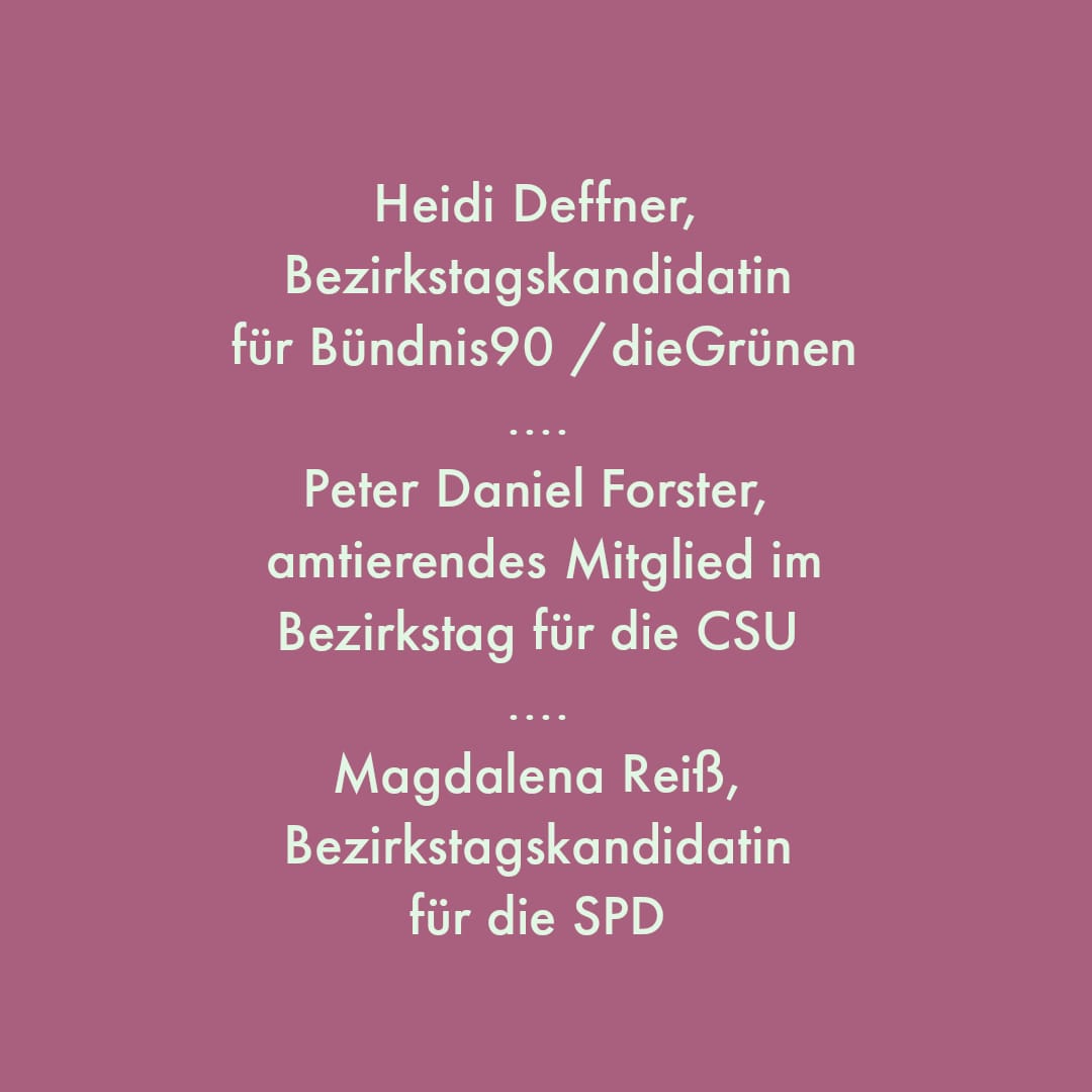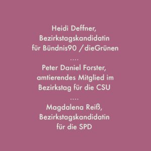 Am 5. Juli 2023 machte der „Runde Tisch Inklusion“ im „Haus der Begegnungen“ ein bisschen Werbung für die Bezirkstagswahl. Dazu wurden Bezirksrat Peter Daniel Forster (CSU) sowie die Bezirkstagskandidatinnen Magdalena Reiß (SPD) und Heidi Deffner (Die Grünen) eingeladen.